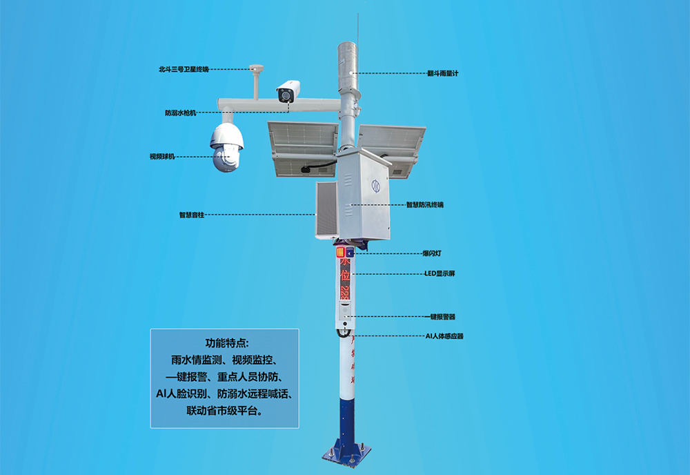 具有雨水情监测,视频监控,一键报警,重点人员协防,AI人脸识别,防溺水远程喊话,联动省市级平台的智慧一体杆,采用模块化集成设计,支持多种传输模式、让水利监测站点部署更简单、性能更可靠、管理更智能。