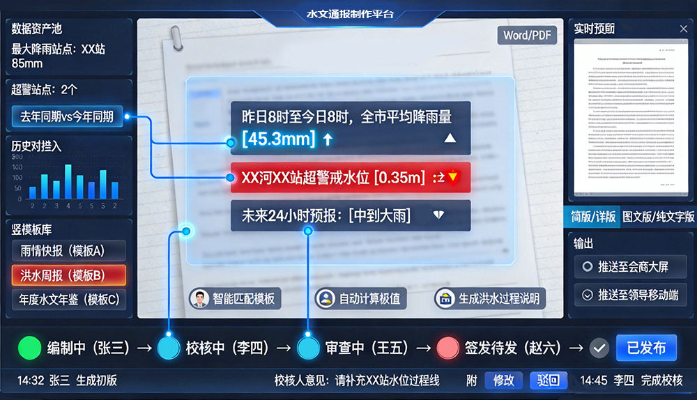 需要更快、更便携实现日、旬、月、水情通报、雨情通报等日常水文通报制作并发布;提高水文工作效率;部分实现自动制作自动生成; 通报可模板定制;固定格式固定日期可自动生成... ...