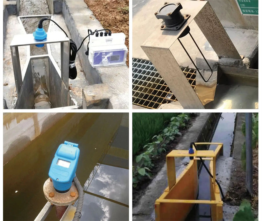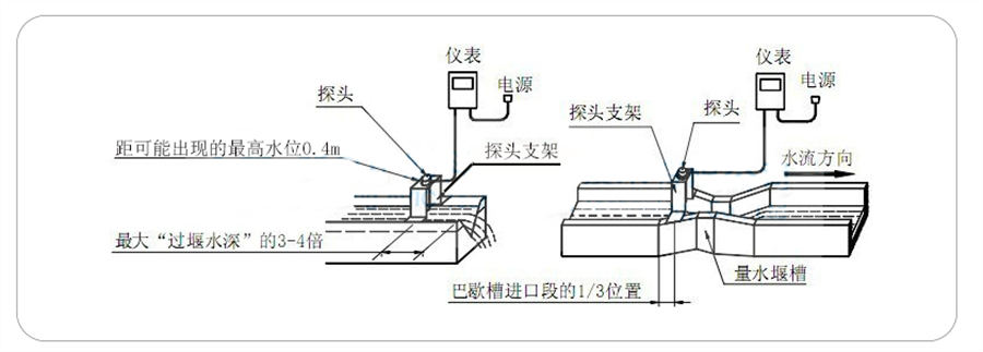 超声波明渠流量计的探头可以直接安装在量水堰槽水位观测点的上方。探头发声的一面要对准水面。可以用水平尺放在探头上盖上,通过校上盖水平使探头对准水面。巴歇尔槽水位观测点在距喉道2/3收缩段长位置(如下图的La)三角堰、矩形堰在上游一侧,距堰板3~4倍大过堰水深处。(如下图)