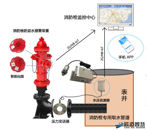 通过智能消防栓闷盖设备内置的水浸传感器,能够感应检测消防栓是否存在出水,当检测到出水时,触发告警并通过2G/3G/4G/NB-IOT网络上传至应用服务器,最终由手机APP推送出水报警信息;