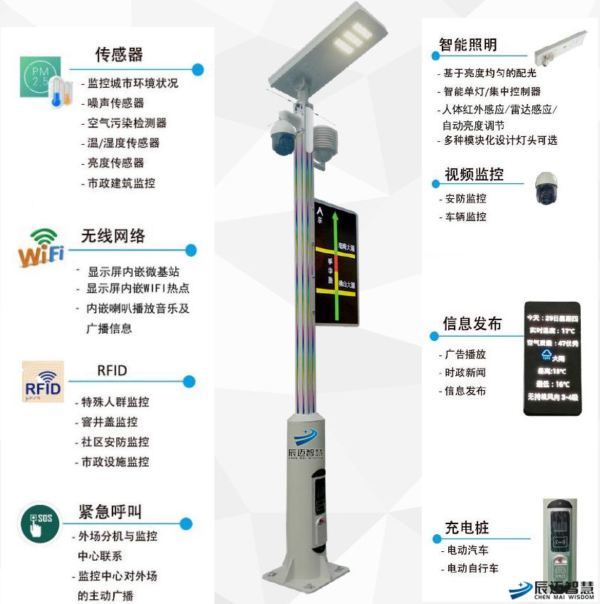 智慧灯杆方案是一种集成各种信息设备技术创新复合应用的智慧路灯产品,整个智慧灯杆内包含路灯照明控制系统、WiFi覆盖、视频监控管理、广告屏播控系统、城市环境实时监测、紧急呼叫系统、电缆偷窃报警、充电桩系统等应用。