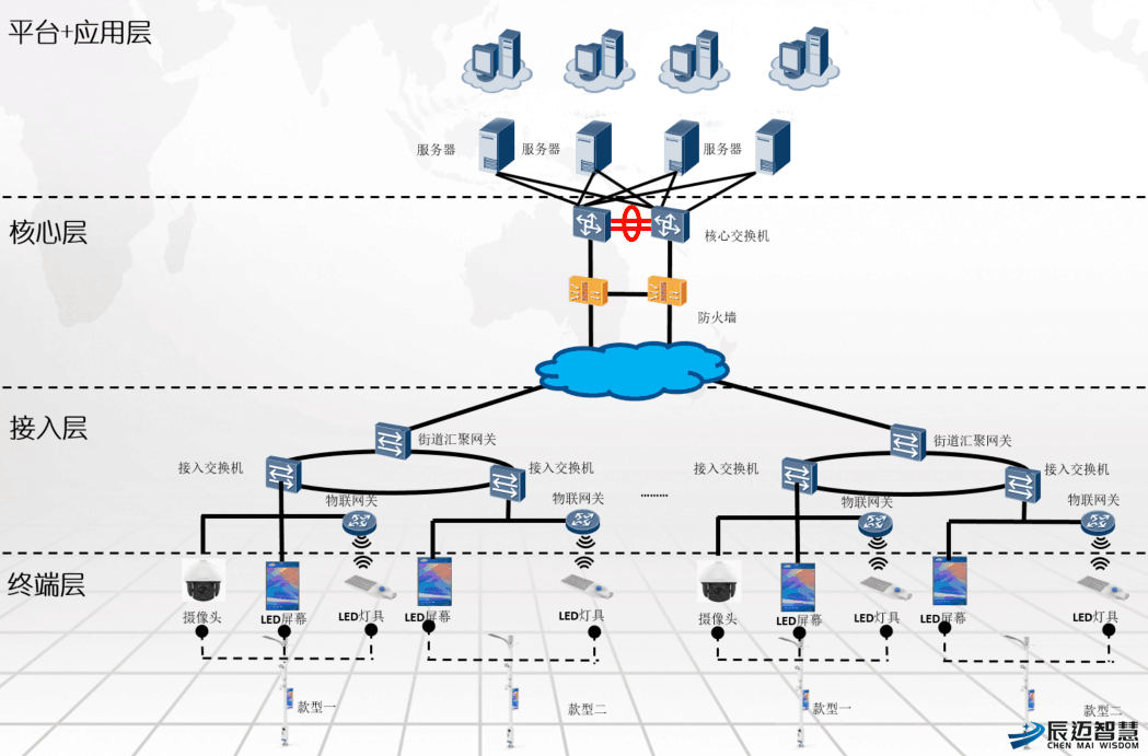 前端设备:前端设备由智慧路灯杆、气象、环境等数据传感器、摄像头、LED屏幕等设备构成,负责相应功能数据的采集。