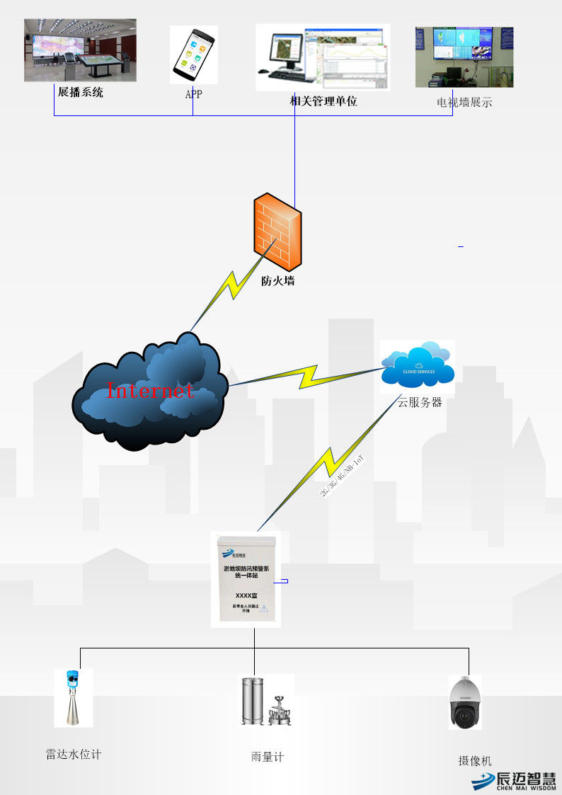 通信平台:2G/3G/4G/LoRa和Internet网络(监测中心需办理固定IP)。现场采集的水位、降雨量数据和图片经2G/3G/4G/LoRa等无线传输到Internet,并通过固定IP地址传送给监测中心服务器。
