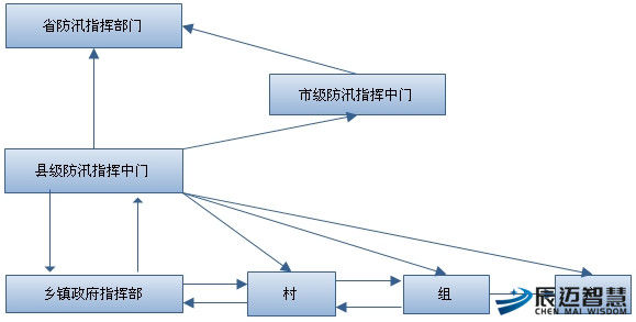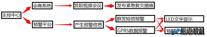 预警信息是通过县级的水雨监测系统的实时监测信息生成的报警信息。预警信息发布是在预警信息生成后,由县级灾害防御指挥中心通过预警信息传输网络进行发布,发生重大灾情时,由主控中心发起视频会商,通过视频会议的方式商讨救灾措施,及时发布相应的救灾指令。发布流程如下图
