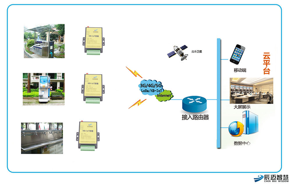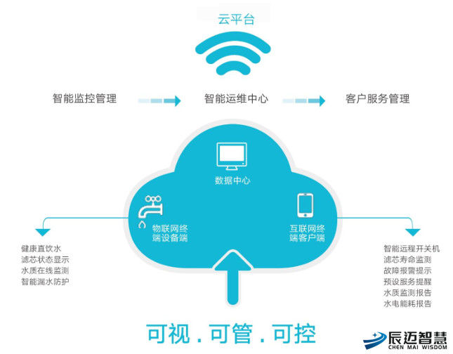 辰迈智慧作为物联网全产业链技术与服务提供商,用物联网技术实现饮水设备的智能化管理,并通过物联网云平台,让用户通过手机设置使用模式,实时了解进水水质、出水水质、用水状况、水电能耗、净水机滤芯状态、设备工作状态等情况。可视、可管、可控的了解净水设备以及直饮水的情况,安心饮用健康好水。