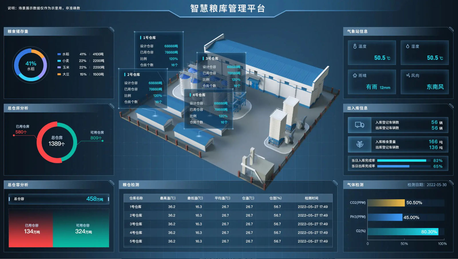 粮食储备是每个国家战略物资中最为重要的一项储备;而随着现代化农业的快速发展以及国家经济发展的需要,我国粮食产量和储备量长期处于世界前列。传统的粮仓由于修建年代久远,可能存在着设施落后,实时监控不到位的现象,导致粮仓容易出现存储温度、湿度、虫害等问题的发生。智慧粮仓是在现有规模化粮仓中,进行改造升级,通过加入多区域温、湿度、空气成分等多类传感器以及视频监控等设施,对粮仓内部以及粮食内部各个区域进行实时监测;另一方面,管理者根据储粮种类、季节气候等多个维度的变化,对粮仓内部进行周期性或应变性的翻拌、熏蒸、加氮、除虫等操作,保障储粮的安全性。