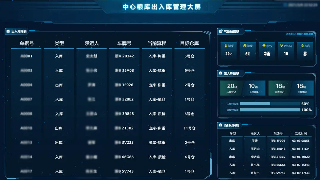 系统综合使用RFID、传感器、智能图像识别等技术,建立快速登记系统、自动扦样系统、快速化验系统、自动称重系统、出入仓确认系统,自动采集粮仓作业数据,保证粮仓出入库数量信息的准确性。