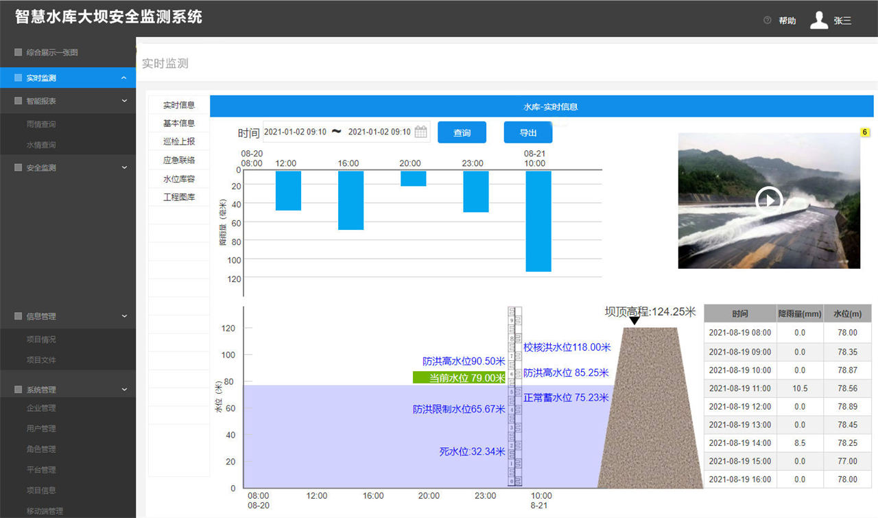 数据实时监测:实现在线监测的地图显示、查看,包括监测设备的快速查询显示、监测数据展示、报警情况显示及监测数据曲线图的实时展示,通过系统主界面的显示功能,可以查看设备的位置、运行状态,掌握其水库库坝体浸润线及坝体内孔隙水压力、库内水位、水库出入入流量、降雨量、坝体位移的实时监测。