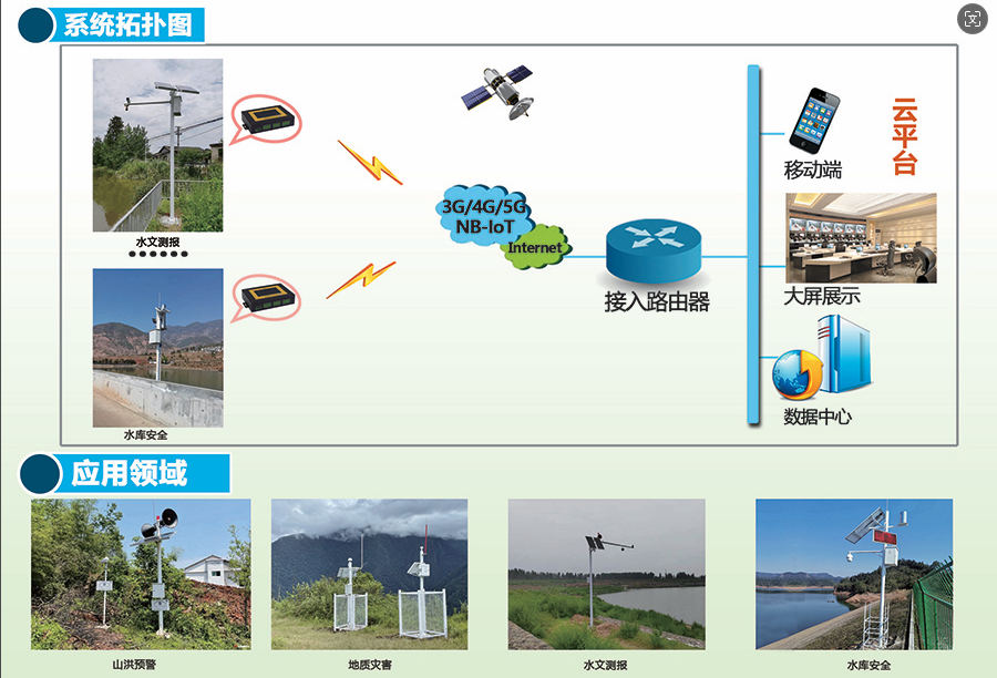 北斗遥测终端机集传统水文遥测终端机功能、2G/3G/4G全网通/NB-IoT/北斗短报文无线长距离传输功能、LoRa无线短距离传输功能于一体,实现水文/水资源/地灾监测/气象等数据的采集、存储、传输、显示、控制、报警及传输等综合功能,同时支持GNSS定位功能。该产品采用高性能的工业级32位通信处理器和工业级无线模块,以嵌入式实时操作系统为软件支撑平台,同时提供翻斗式雨量计接口、RS232、RS485、SDI-12、有线网口、4~20mA及0~5V模拟量输入、开关量输入、继电器输出和开关量输出接口,可满足各种不同应用的需求。广泛应用于山洪灾害监测预警、水库大坝安全监测、自动雨量站、水位站、雨水情监测站、森林防火监测站、气象监测站等无人值守自动化监控场景。
