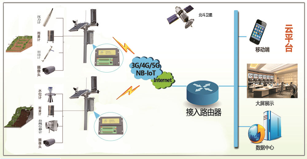 感知层:实时感应边坡监测参数传感器的状态,如地下水位、土壤含水率、土压力、雨情等前端感知设备;