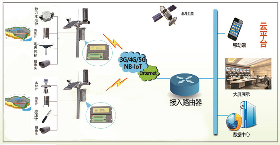 (1)感知层:矿区在线监测仪,包括降雨量、水位监测仪、浸润线监仪、表面位移监测仪和视频监控摄像机、干滩监测和现场视频进行连续自动在线监测;