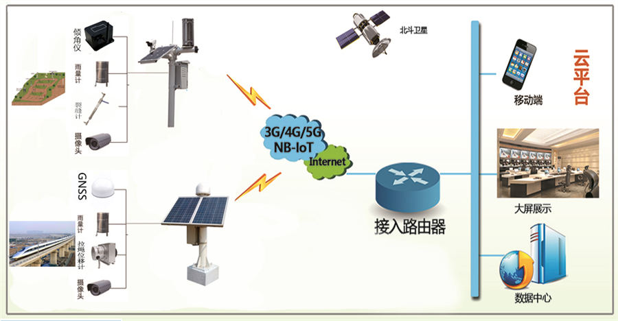 感知层:实时感应高速铁路监测参数传感器的状态,如表面位移、深部位移、渗流量、降雨量、裂缝、支护结构、地下水位、土壤含水率、土压力、表面位移监测仪和视频监控摄像机等前端感知设备;
