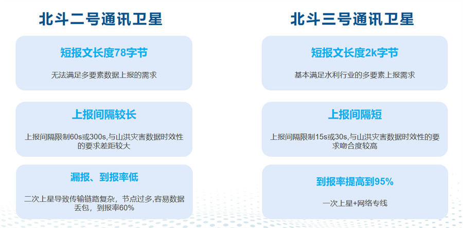 新阶段山洪灾害自动监测站的建设,必须解决现有测站存在的不足,才能真正满足防洪“四预”的系统建设要求。为此,水利部印发了《2022年度山洪灾害防御能力提升项目建设工作要求》,明确了新阶段山洪灾害建设的要求。北斗三号卫星的推出,极大地解决北斗二号卫星通讯在山洪灾害预警监测站中的应用缺陷。针对山洪灾害测站短报文北斗通讯的应用,北斗二代与北斗三代的功能对比如下: