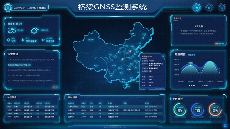 桥梁GNSS监测系统由前端数据采集设备、供电设备、传输设备、监控中心和移动APP组成,前端的数据采集主机将采集到的视频图像、倾角计、位移计、位置对比等数据通过2G/3G/4G/5G/NB-IOT等无线方式传输到监控中心,监控中心软件可以显示并分析前端设备采集的数据,移动APP可以实时查看当前监测情况,当出现警情时会发出预警信息,提醒相关指挥人员做好抢险救灾工作准备。