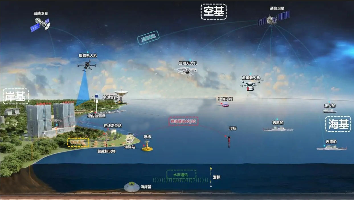 智慧海洋灾害监测预警系统主要通过分布于天、空、岸、海、底的各种观监测传感器、各类基站及组网技术,辅以志愿船、科考船等手段获取观测海域的区域数据与信息,实现海洋水文气象监测、海洋生态环境监测、海域动态监控、海洋环境监测等,并通过网络通讯传输至数据应用示范系统,进行实时信息展示。