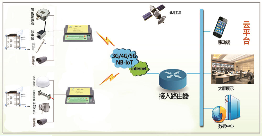 房屋结构安全监测系统是对房屋沉降、倾斜、裂缝等影响房屋结构安全的数据指标进行全天实施在线的监测系统,采用层次化设计方法,可分为感知层、采集层、云端层和交互层。将各类传感器设备安装在房屋各关键部位进行实时监测,数据接入到采集设备,采集设备初步运算后通过4G无线网络将数据输出到云服务器,云服务器将数据进行分析处理后下发到后端监测平台,实现数据协同、及时预警、问题可控的信息自动化监测预警系统。 房屋建筑结构安全自动在线监测系统架构如下图所示,其主要由感知层、数据采集层、传输通信层、云平台及移动终端组成。