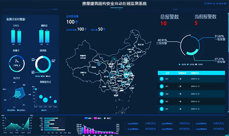 ■24 小时实时监测:对房屋倾角传感器、裂缝计、静力水准仪等全自动化在线监测,实时掌握房屋整体施工/运行的安全状态、从整体上把握房屋健康和安全状态。