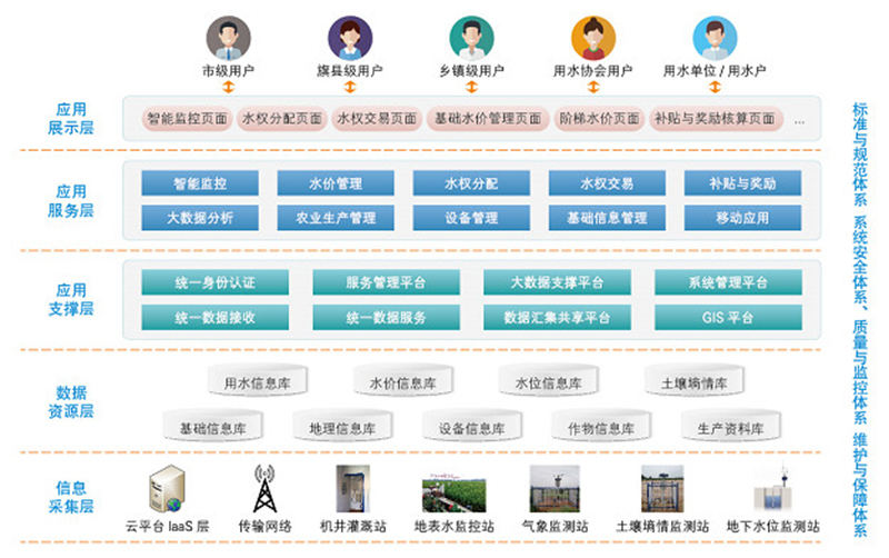 方案采用物联网技术,通过建设各类信息采集监测站和控制站,利用多种传输方式及时采集实时监测数据。以这些数据为基础,以水价改革为核心,针对用水户、用水单位、用水协会和各行政区划,围绕智能监控、水权分配、水价管理、水权交易、农业生产管理、精准补贴和节水奖励等业务,强化业务信息处理能力和大数据分析能力,建立能够适应各级水利部门使用的农业水价综合改革管理平台,实现省、市、县、乡、用水协会、用水户等多级用户的业务协同,提升各地区水价综合改革能力,为用户提供软硬件一体化的农业水价综合改革整体解决方案。平台主要功能如下: