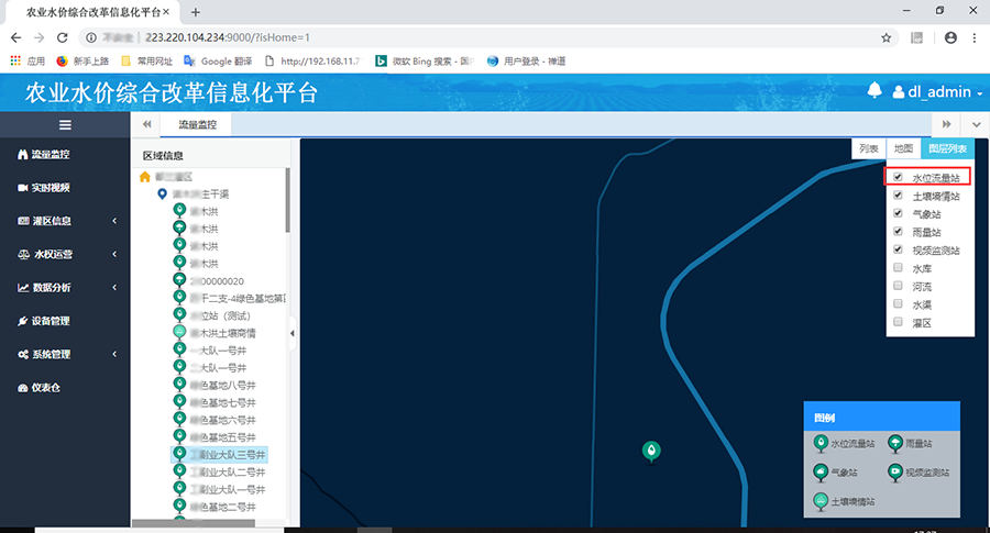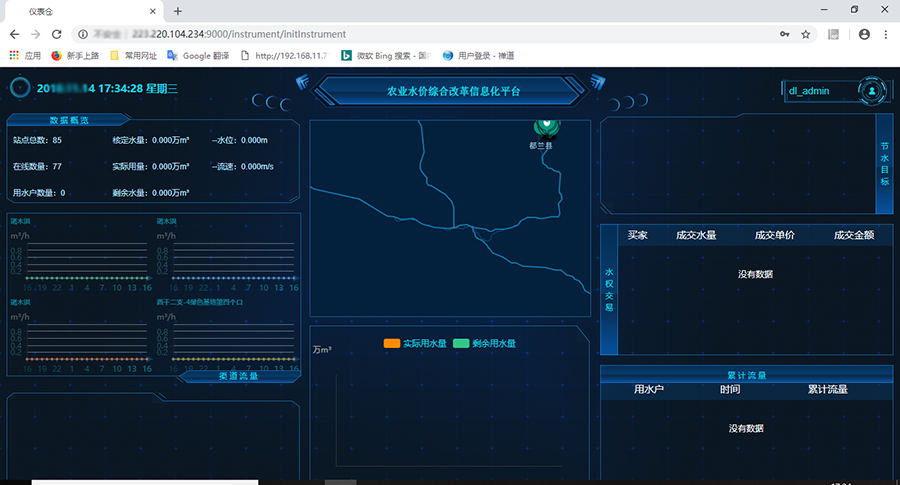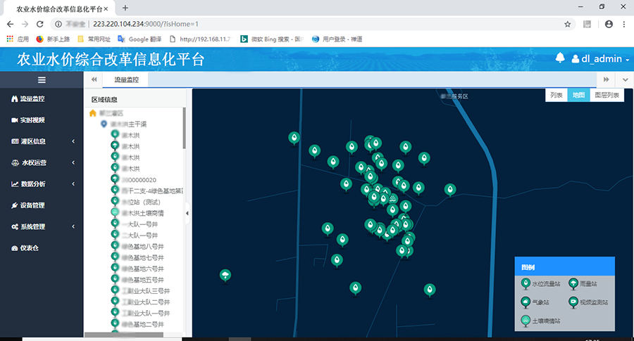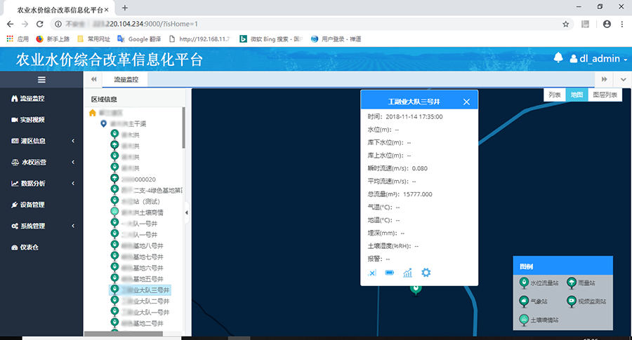 ① 综合监视: 以GIS地图为基础,以用户数据为依据,在地图上展示各类站点的地理信息及实时监测数据,各行政区划的水价、水权信息,并可以对监测数据进行统计分析。其中,监测数据包括地下水位、地下水温、用水量、用电量、站点预警等数据。