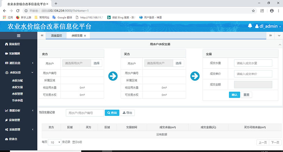 ④ 水权交易:为用户提供一个高效、方便、易操作的交易平台,平台的功能包括整个水权交易的过程,并提供对水权转让信息的在线发布、查询,为水权出让者提供水权转让的平台。交易完成会给出交易结果,并公布交易信息。