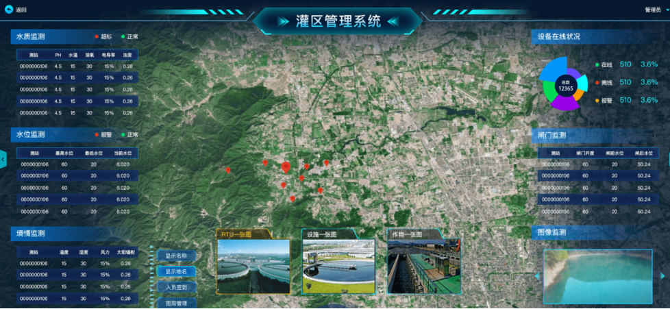灌区管理一张图:基于GIS技术,聚合基础地形图、行政区图、土地利用现状图、基本农田保护图、水系分布图、防汛工程分布图、灌溉工程分布图、灌溉面积分布图、水雨工情监测分布图、水资源红线图、遥感影像图等多源信息的地图,叠加灌区水资源及工程管理等业务管理系统,构建统一的“地下测、网上控、平台管”的灌区综合监管“一张图”。