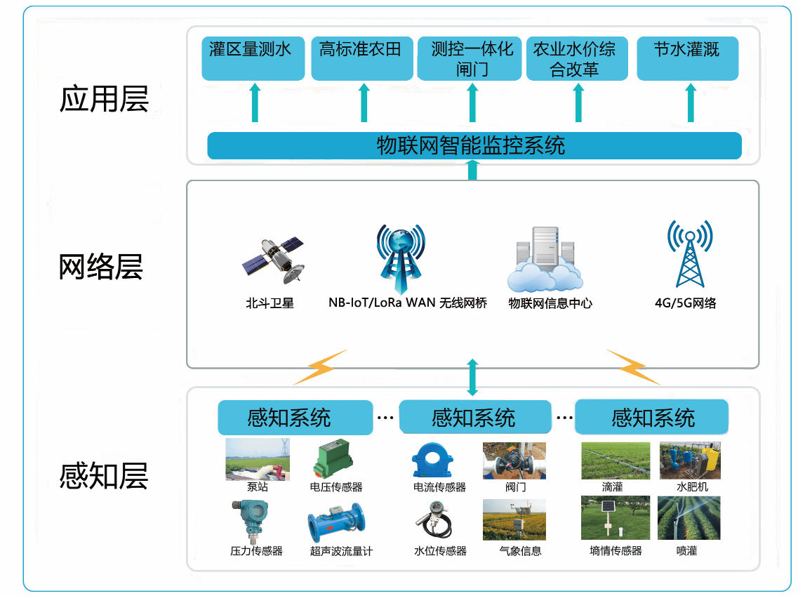 感知采集层:采集包括灌区内所有的水位监测、水量监测以及灌区范围内其他的所有传感器的监测,利用全方位感知技术对灌区信息进行实时采集。 通过实时的采集信息,为作物灌溉提供分析和决策基础。