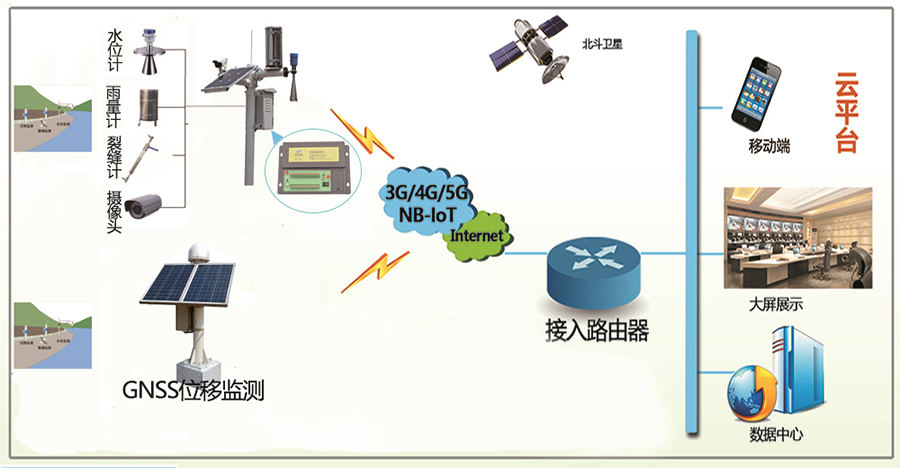 前端采集站:由位GNSS移传感器、裂缝传感器、水位传感器、图像采集摄像机组成,主要的功能是实时采集现场的水位、位移、雨量、图像等信息。