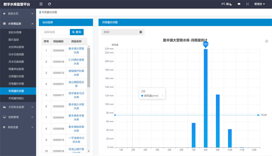 大坝安全监测功能:主要实现监测点设置、监测信息查询、数据整编、相关分析等功能,形成完整的大坝监测体系。