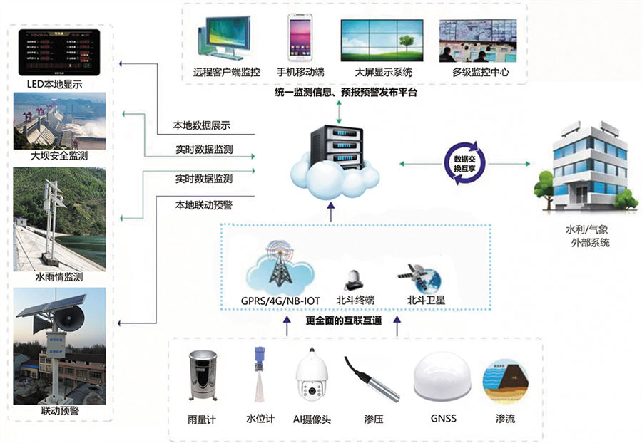 水库大坝除险加固安全监测系统方案主要由水库水位监测系统、水库水雨情监测系统、水库大坝安全监测系统、报警系统等组成。现场通过各传感器、测量仪表、摄像头等监测设备进行目标数据获取,通过水利遥测终端机数据采集、存储、上报、控制、显示;水库监测预警云平台数据接收、数据处理分析、数据监测、设备远程控制、命令下达、预警广播等,实现水库智能化全天候自动监控。