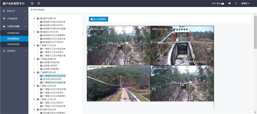 实时监控:通过高清摄像头视频监控水库大坝现场实况,在汛期或险情发生时可实现远程巡检;同时支持视频图像实时叠加,定时拍照,实时推送监测数据与测点信息。实现在线监测的地图显示、查看,包括监测设备的快速查询显示、监测数据展示、报警情况显示及监测数据曲线图的实时展示,通过系统主界面的显示功能,可以查看设备的位置、运行状态,掌握其水库库坝体浸润线及坝体内孔隙水压力、库内水位、水库出入入流量、降雨量、坝体位移的实时监测。