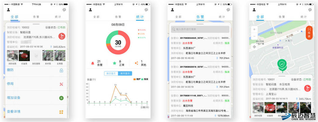 6、APP联动:通过手机APP,相关授权人员可以随时、随地了解各区域、个街道消防栓的实时监控情况,接受报警信息,进行远程预警及远程控制操作。